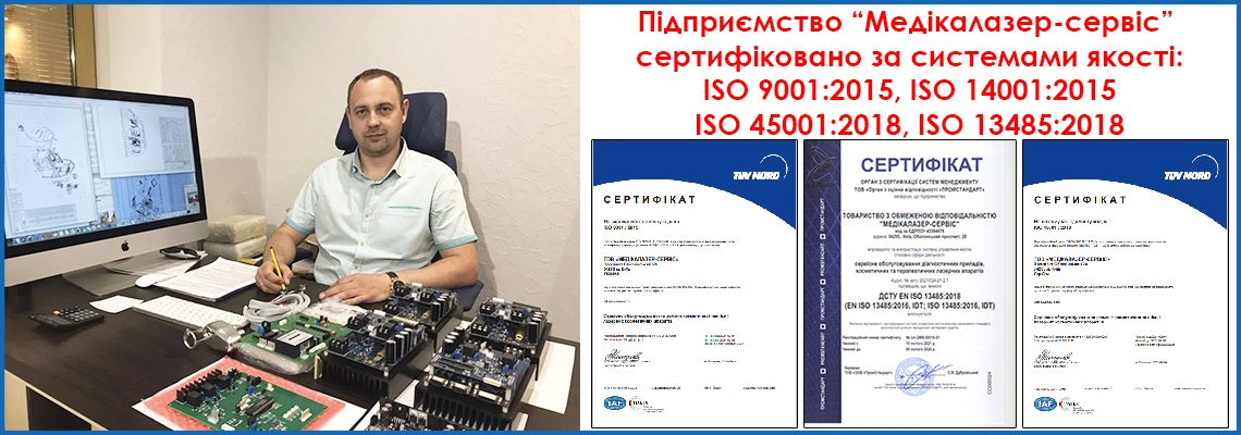 Компанія "Медікалазер-сервіс" має необхідні види сертифікації для обслуговування складної косметологічної та лазерної техніки, випущеної компанією "Медікалазер". Але також компанія "Медікалазер-сервіс" може обслуговувати і техніку інших виробників. Обслуговування техніки інших виробників планується почати після переїзду на нову робочу площадку. Нижче наводяться посилання на органи, які проводили сертифікацію. Ви можете прочитати текст сертифіката в збільшеному розмірі, якщо натиснете на зображення сертифіката.