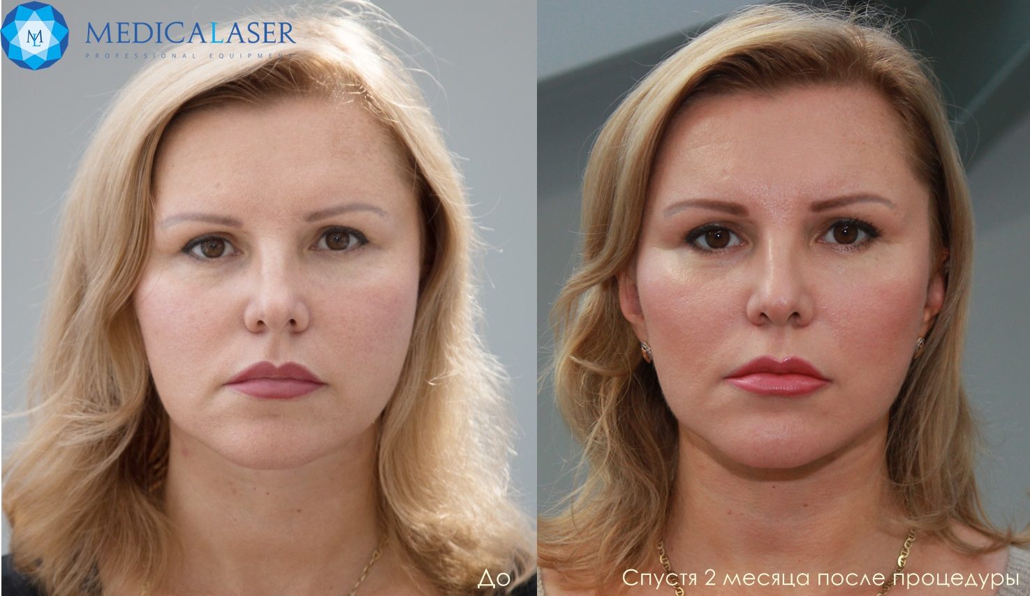На фотографіях представлений результат проведення процедури. На лівому фото у пацієнтки спостерігається яскраво виражена асиметрія обличчя (істотно різний рівень брів і нижнього краю правого ока). На правому фото чітко видно підйом правої орбітальної і надбрівної області. Помітно зменшення глибоких жирових пакетів обличчя (схуднення). Збільшилися тургор і щільність шкіри.